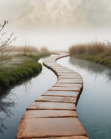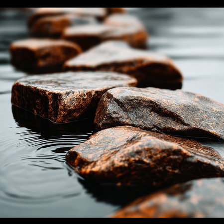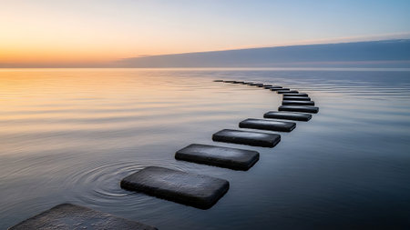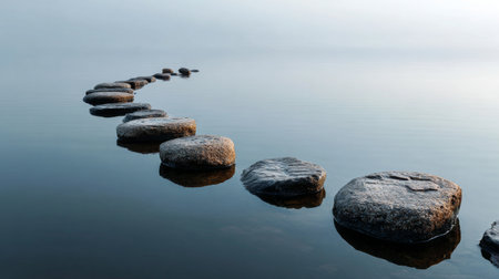 A serene pathway of smooth stones extends across calm water, creating a tranquil atmosphere under a gentle sky, perfect for introspection and escape.