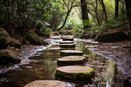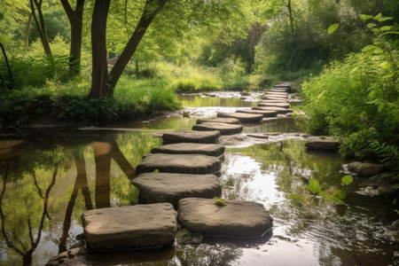 stepping stones that lead across a stream or creek, with greenery and wildlife in the background, created with generative ai