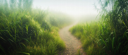Misty forest trail lined with moss-covered stones leads into the foggy mountains, creating a mysterious and tranquil natural scenery, Ai-Generated.
