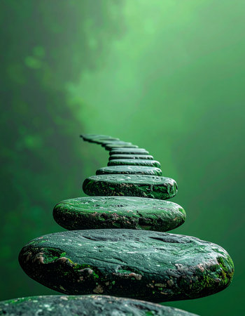 A carefully balanced stack of stones forms a spiral staircase, leading the eye upward into a soft, green, misty forest. This image evokes a sense of peace, meditation, and the personal journey towards balance and spiritual growth.