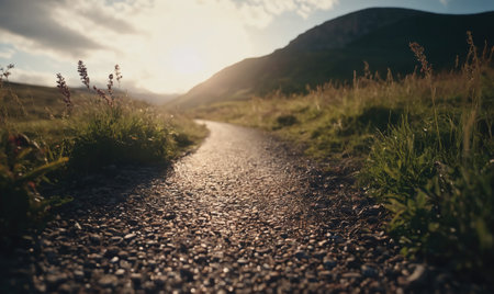 A picturesque sunset pathway surrounded by colorful wildflowers creates a serene atmosphere in a vibrant countryside setting, inviting peaceful exploration.
