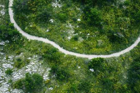 This aerial photograph showcases a meandering path surrounded by a dense forest, providing a birds-eye view of the natural landscape, An aerial shot of a long, winding running trail, AI Generated