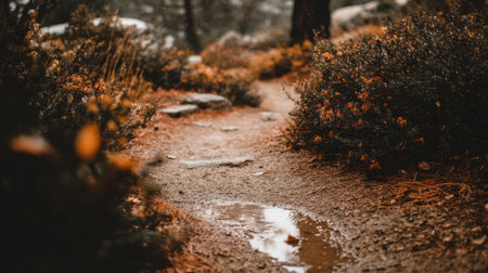 A narrow dirt trail meanders through a dense woodland during fall. The ground is blanketed with orange and brown leaves, and a small puddle reflects the overcast sky.