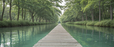 AI Generated. A wooden walkway next to a body of water surrounded by trees