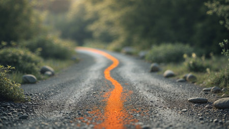 AI Generated. Gravel road with orange line and scattered stones surrounded by greenery in soft focus perspective copy space