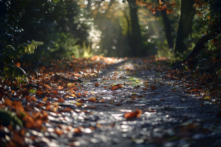 Morning sunlight filters through the trees, illuminating a wet path strewn with colorful autumn leaves in a serene forest.
