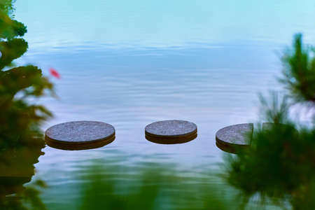 Round solid islands in the water for a walk. water surface.