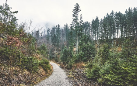 Hiking trail in the misty forest. Beautiful natural landscape.