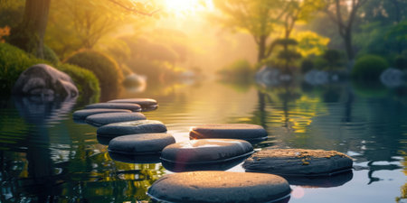 Serene Stepping Stones Pathway Through Calm Water in a Zen Garden Setting for Tranquil Meditation