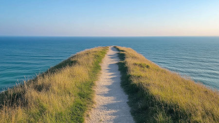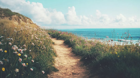 A picturesque coastal pathway lined with vibrant wildflowers, leading to a stunning ocean view beneath a clear blue sky, inviting exploration and serenity.