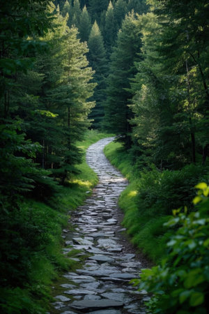 Sunlight filters through the trees, illuminating a tranquil path winding through a lush green forest, creating a serene and inviting atmosphere