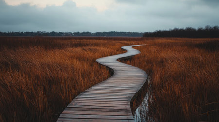 A curving wooden path stretches through golden marsh grass, backing visitors to explore the tranquil landscape under a moody sky. Nature's beauty invites calm reflection.