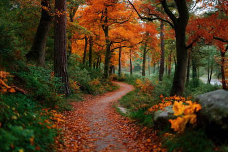 Fallen leaves cover a winding path leading through a forest displaying vibrant autumn colors