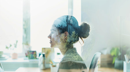 A split image: on the left, a woman works on a laptop at a cozy table with sunlight; on the right, people in a modern office discuss while another woman practices yoga on a mat.