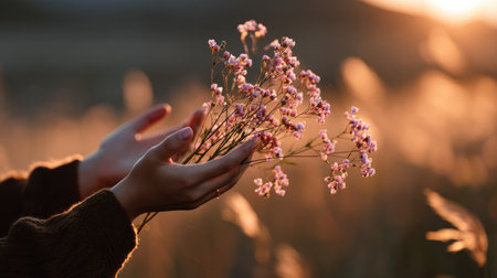 Hands of a woman holding wildflowers glowing in the sunset light, soft wind and golden tones all around