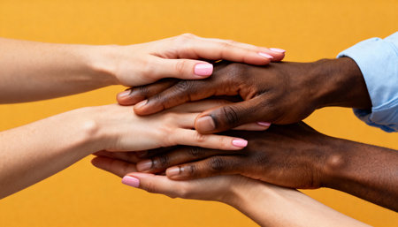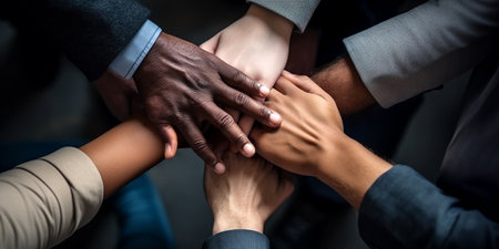 Diverse hands symbolizing teamwork, empathy, partnership, and social connection in business