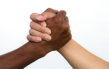 The fight against racism. Two hands of different nationalities compress each other as a sign of support and solidarity.