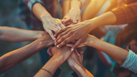 A diverse group gathers, placing hands together in a symbol of unity and support during a community event in the evening atmosphere, promoting togetherness.