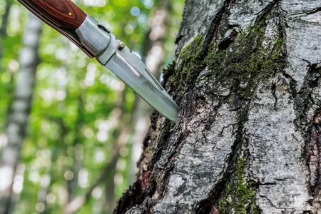 sharp knife stuck in the trunk of a birch tree close-up tagging to find the way back