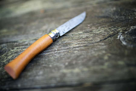 Folding pocket knife on a wooden background. Vintage photo of a knife. Knife in folded position. Knife with clip. View from above.
