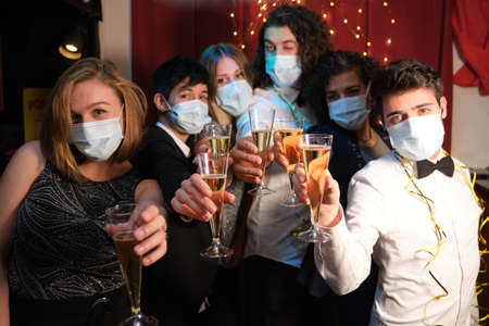 Group of fiends wearing face masks at a Christmas party looking at the camera in a bar. Coronavirus new normal.