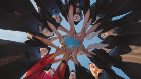 Graduates in academic gowns joining hands around a globe, symbolizing readiness to embrace global opportunities and impact the world