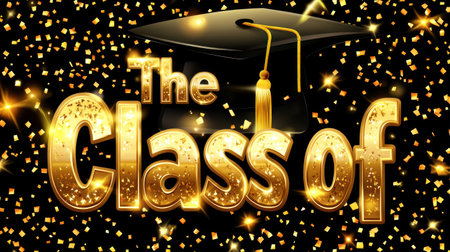 The words The Class of in shiny gold letters with a cap and tassel on top, centered on a black background with golden confetti all around. A beautiful celebration for the class of 2025. Vector illustration design for a graduation party or drawing space banner. Isolated, high-resolution vector, highly detailed, no mockup or frame, clipart. --chaos 30 --ar 16:9 --v 6.1 Job ID: d0a29a9a-ed75-4ab0-bdfb-4e1b4d49ac72