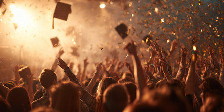 Energetic concert crowd celebrating under colorful confetti during an electrifying live performance at night