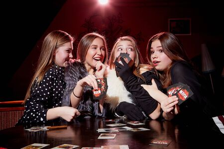 Kirov, Russia - December 19, 2018: Group of girls with playing cards near table in a dark room with red light. Photo shoot in gangsters style