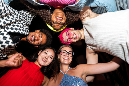 A vibrant image capturing a group of multicultural friends laughing and enjoying a celebration together at night. Perfect to depict joy and friendship.