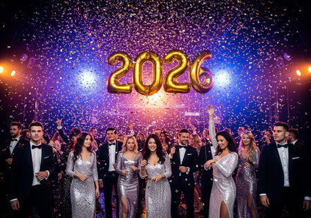 Diverse friends toasting at a vibrant New Year's party with confetti.