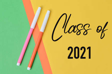 Top view of pen colors over colored paper written with CLASS OF 2021. Education concept.