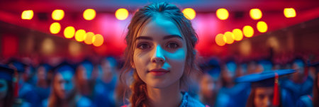 A group of students in graduation attire walking through an architecturally grand space, illuminated by colorful lights. Graduation concept, and bright future illuminated by the glow of knowledge