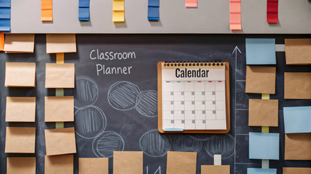 Colorful sticky notes surround a calendar on a blackboard in a classroom setting.