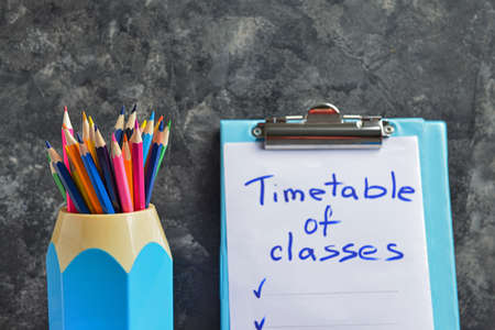 Set of school supplies and timetable on gray background