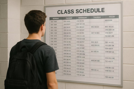 University student reviewing class schedule poster in hallway. concept of academic planning, higher education, college semester.