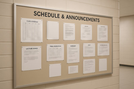 University announcement board displaying class schedules, lecture series, and final exam timetables in hallway. concept of academic information, campus communication, student resources.