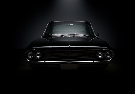 A close-up, full-frontal view of a classic black car, set against a completely dark background. Generative Ai