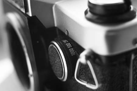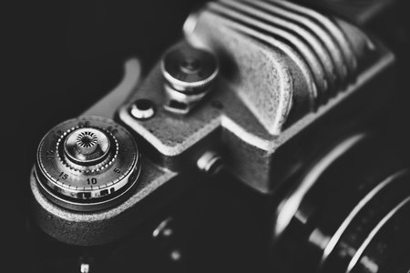 Close-up of a vintage camera reveals its intricate mechanical details, evoking nostalgia for classic photography and creativity.