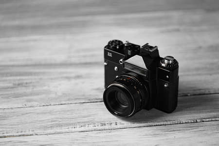 A black old camera, a remote sensing device for capturing or recording images which may be stored locally on a gray wooden blurred background.
