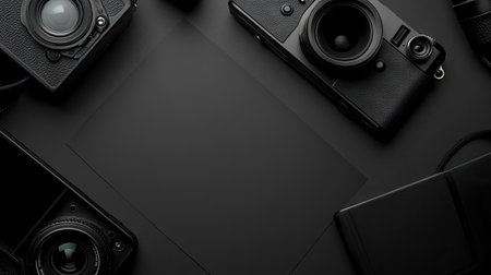 Black and white paper with a camera on a black background, flat lay. A minimalistic concept of a graphic designer's or photographer's workspace. Top view, copy space banner template for a creative studio business. --chaos 30 --ar 16:9 --v 6.1 Job ID: a5485c22-6e6b-48d7-b122-3df430c847fb