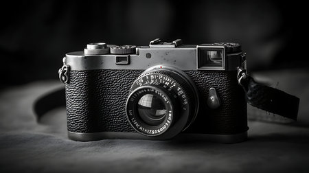 A black-and-white image of a classic camera with a leather strap, evoking a sense of nostalgia.