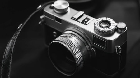 A vintage camera with a black and silver body is prominently displayed against a stark black background. The camera features a large lens and various dials and buttons, highlighting its classic design.