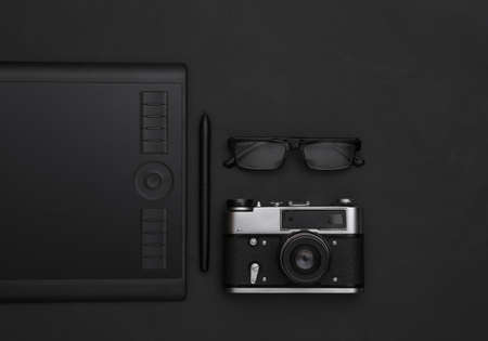 Cropped shot of dark modern concept workspace with camera, stationery, glasses, digital devices and copy space