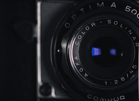 Vintage analog medium format film camera close up view. Vintage film camera with bellows.