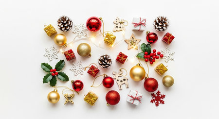 Christmas decoration on white background. Top view with copy space. Flat lay.