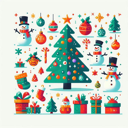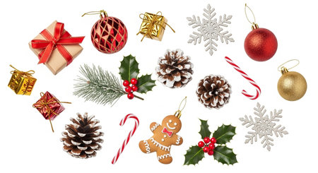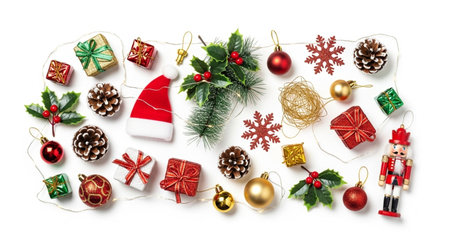 Festive Christmas decorations on white background with red, green accents.