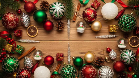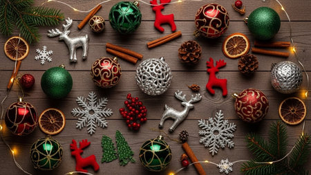 Festive Christmas Decorations Displayed Beautifully on a Wooden Table - Captivating 3:2 Aerial View