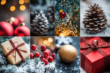 Christmas collage showcasing traditional decorations, gifts, snowy fir branches, and pine cones, evoking a warm festive atmosphere