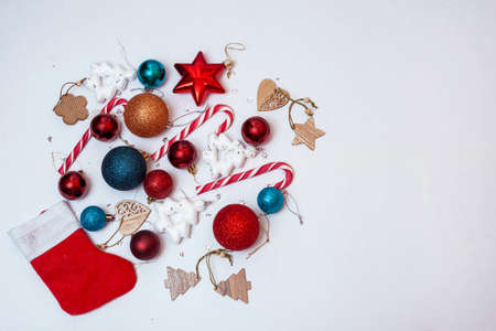 Christmas mood concept. Layout composition with traditional festive attributes. Flatlay